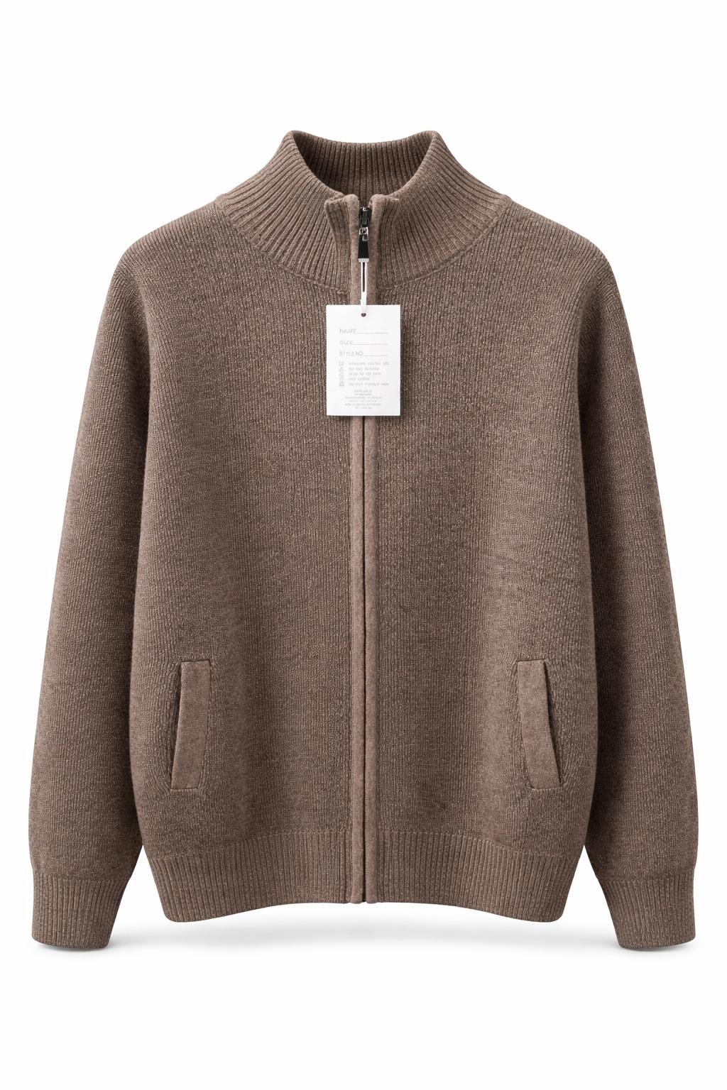 Chaqueta de punto con cierre de cremallera frontal y cuello alto acanalado.